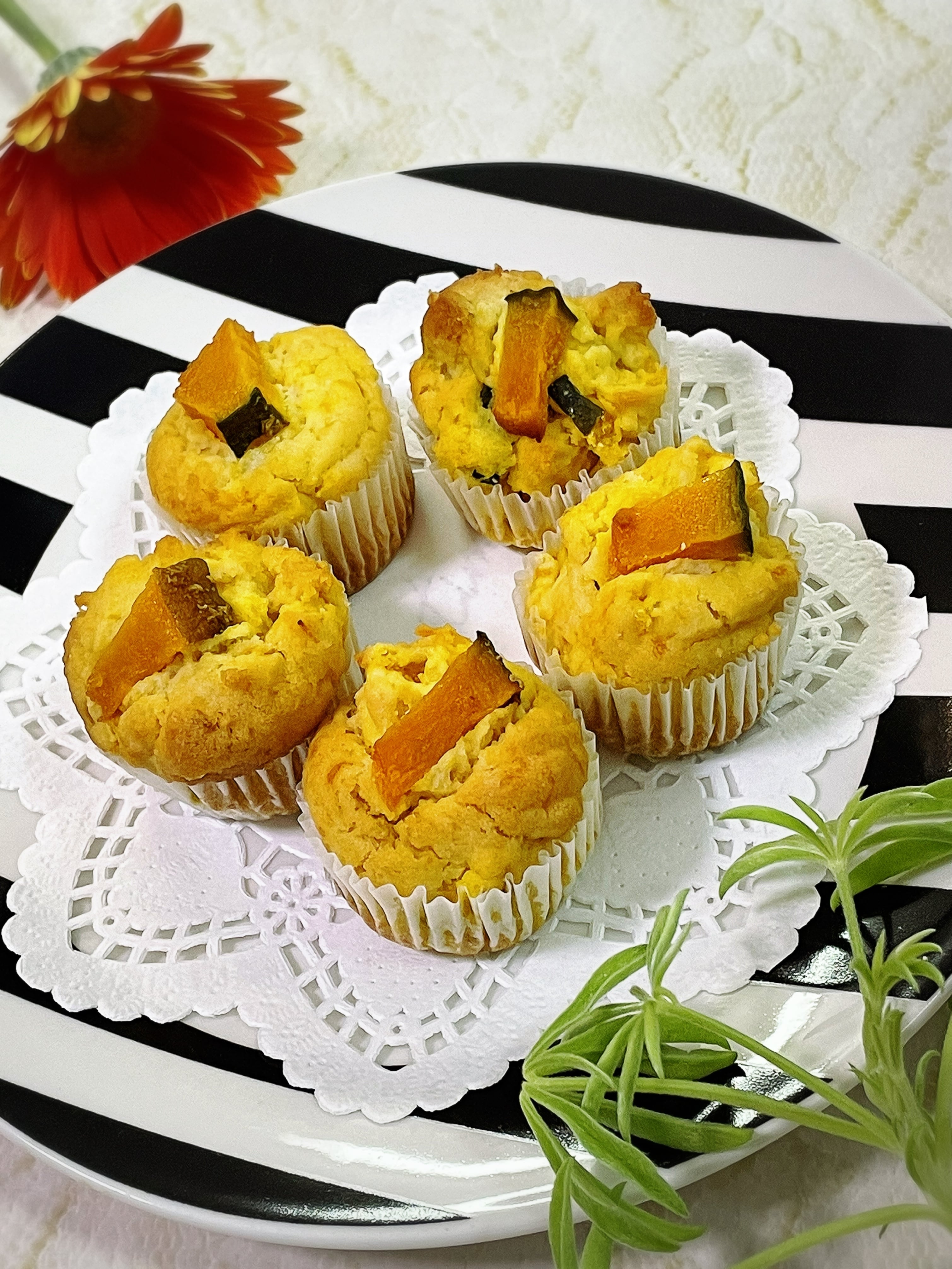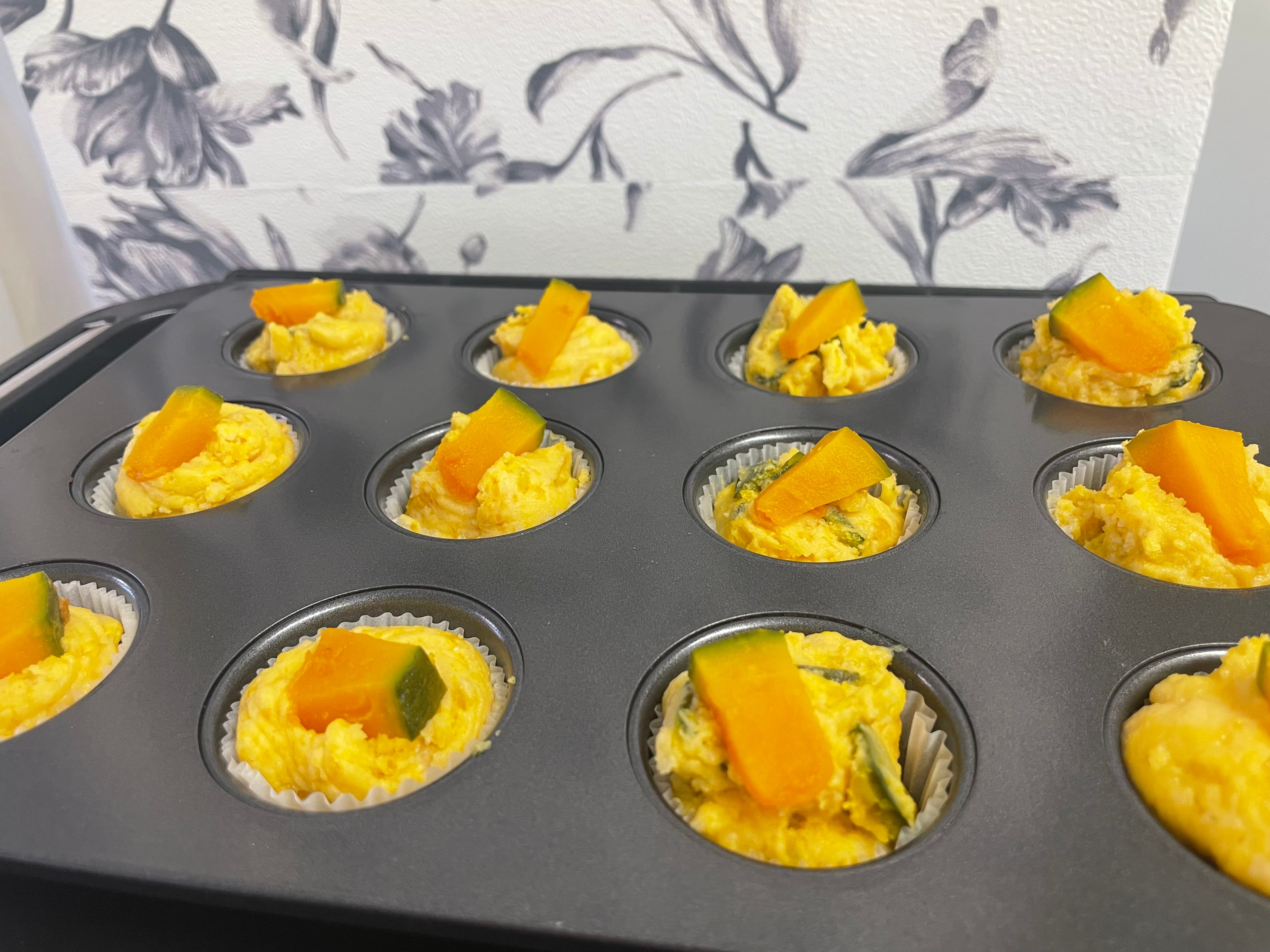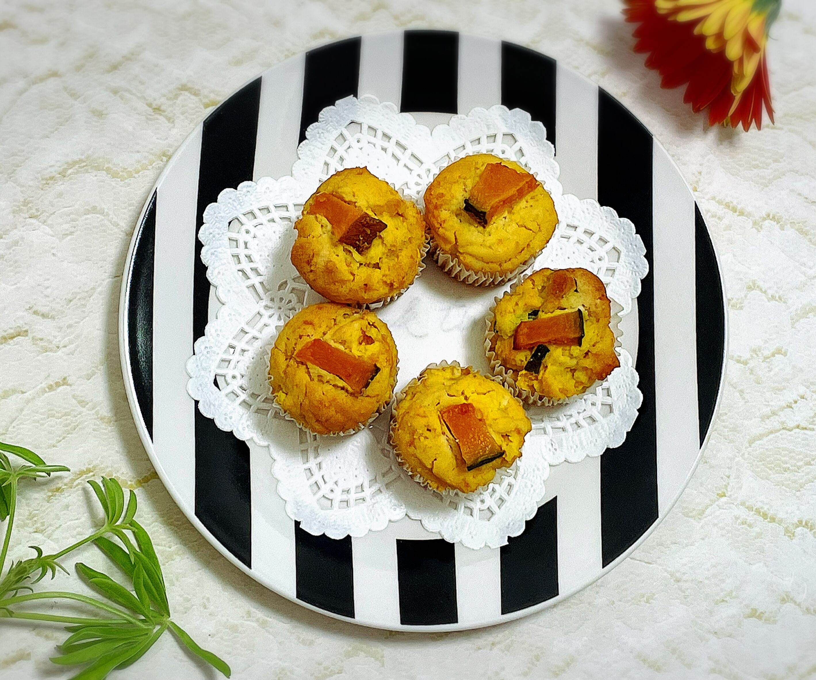 ⚫︎メープルシロップのみの甘さで作った生地にカボチャを生地に練り込み、カボチャをトッピングしたアーモンドエクストラの風味豊かなカップケーキです。
